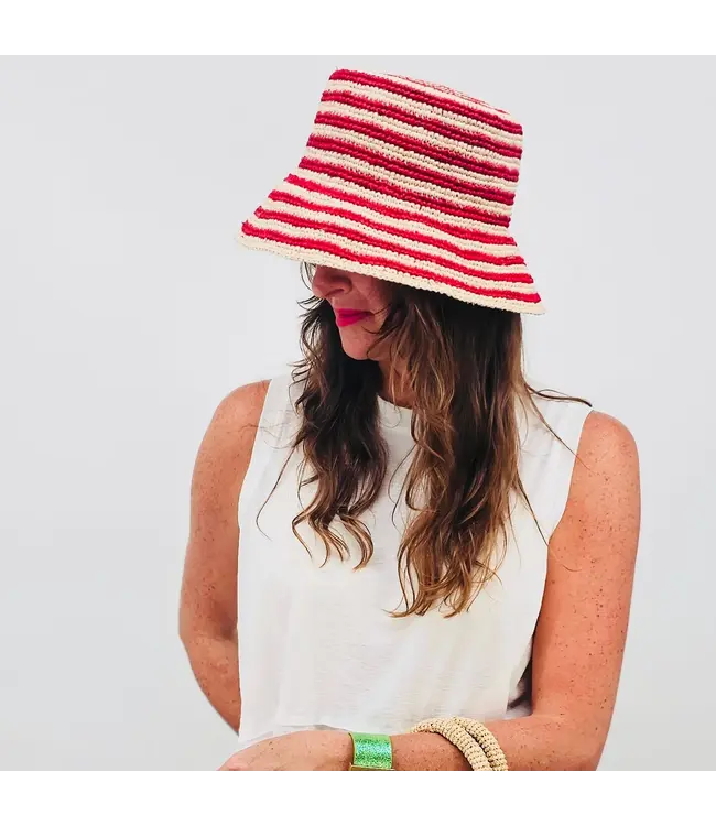 Red and Hay Striped Beau Raffia Bucket Hat