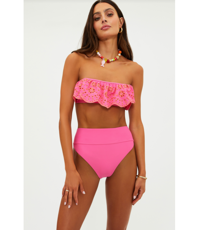 Tanvi Top · 82% nylon, 18% spandex · Eyelet ruffle detailing · Interior gripper tape along neckline · Removable cups and straps · Hook-and-loop styling
