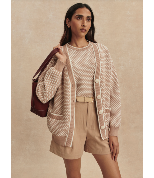 A longline cardigan is an undone alternative to a spring jacket. The Tarran is a textured, 100% cotton cardigan with a longer length and relaxed boyfriend shape, finished with bold pocket trims and a matching placket.